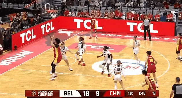 第一节比赛中,张子宇篮下接球强攻打进,中国女篮追至11-18落后比利时。